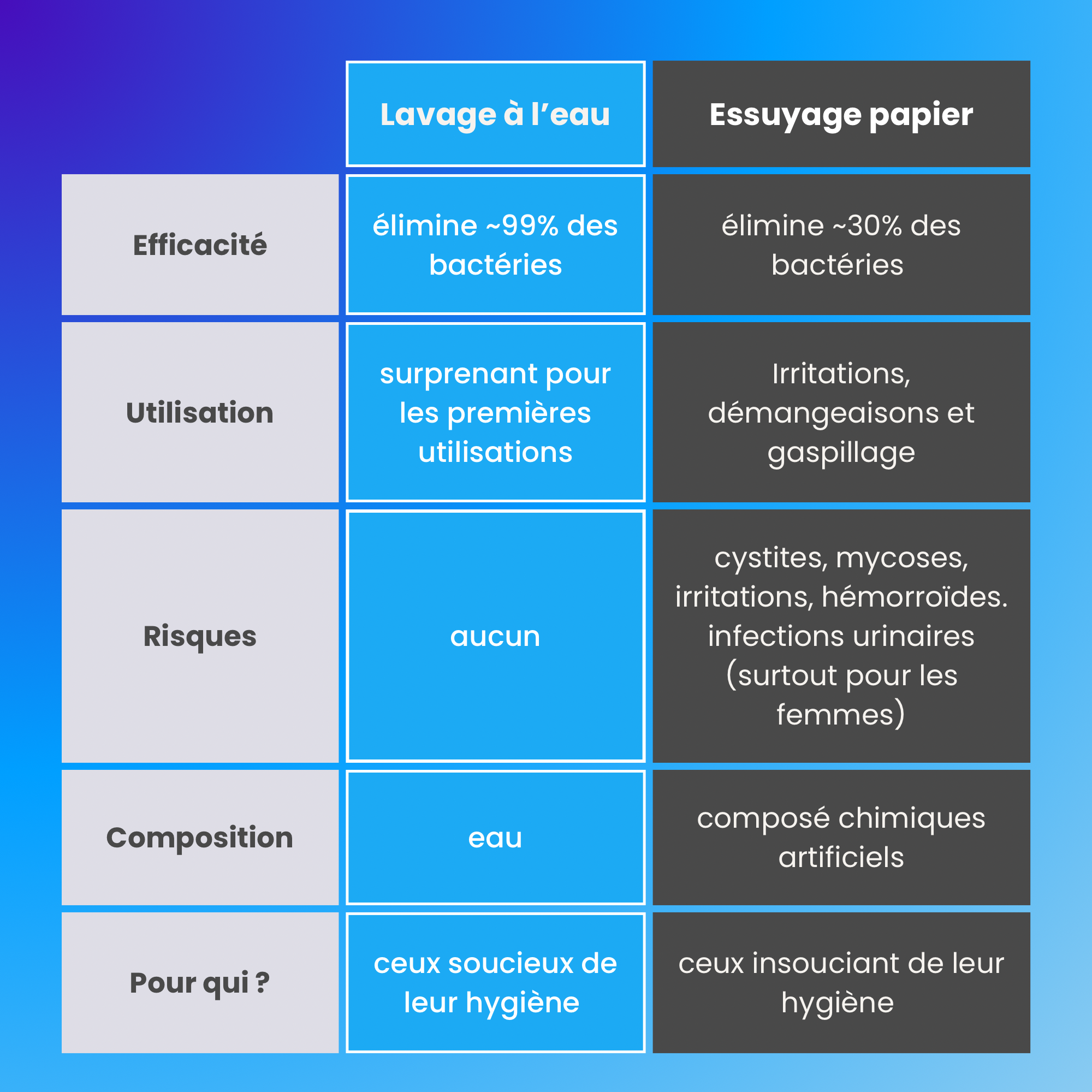 L’eau élimine jusqu’à 99 % des bactéries, alors que le papier toilette n’en retire qu’environ 30 %.